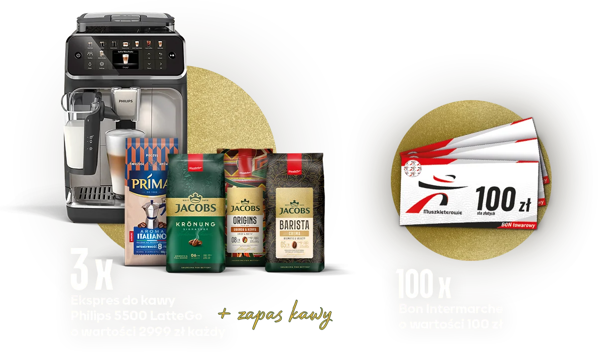 - Nagrody I Stopnia: 3 x ekspres Philips 5500 LatteGo o wartości 2999 zł każdy (słownie: dwa tysiące dziewięćset dziewięćdziesiąt dziewięć złotych) + zapas kawy o wartości 300 zł każdy (słownie: trzysta złotych), łączna wartość nagrody I Stopnia to 3299 zł każda (słownie: trzy tysiące dwieście dziewięćdziesiąt dziewięć złotych)