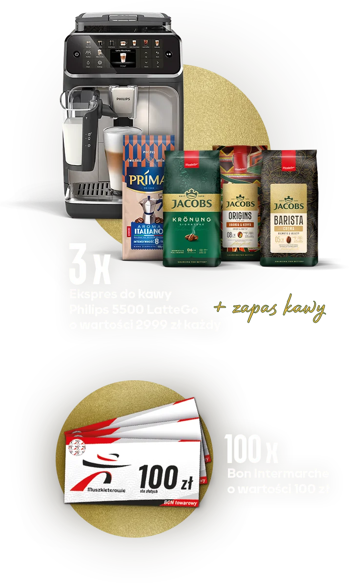 - Nagrody I Stopnia: 3 x ekspres Philips 5500 LatteGo o wartości 2999 zł każdy (słownie: dwa tysiące dziewięćset dziewięćdziesiąt dziewięć złotych) + zapas kawy o wartości 300 zł każdy (słownie: trzysta złotych), łączna wartość nagrody I Stopnia to 3299 zł każda (słownie: trzy tysiące dwieście dziewięćdziesiąt dziewięć złotych)